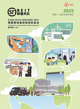環境、社會及管治 環境、社會及管治 關於房託管理人 順豐房託致力成為一個負責任的企業公民,在最大限度地回報持份者,並同時盡最大努力減少對環境的影響。 房託管理人將與順豐控股股份攜手合作,不斷改善環境、社會及管治等方面的表現。 上一張 下一張 環境、社會及管治報告20252026年4月環境、社會及管治報告20242025年4月環境、社會及管治報告20232024年4月環境、社會及管治報告20222023年4月氣候相關披露報告2022年11月環境、社會及管治報告20212022年5月